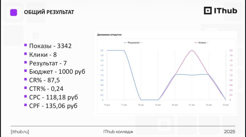 В конце декабря на кафедре маркетинга и коммерции IThub прошла защита работ мастерской таргетированной рекламы. И это был тот случай, когда за студентов говорили не оценки в зачётках, а метрики в рекламных кабинетах.